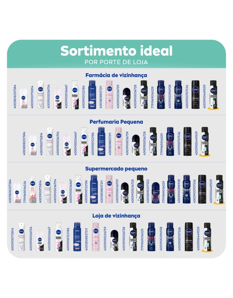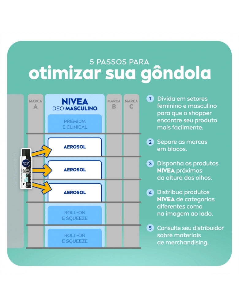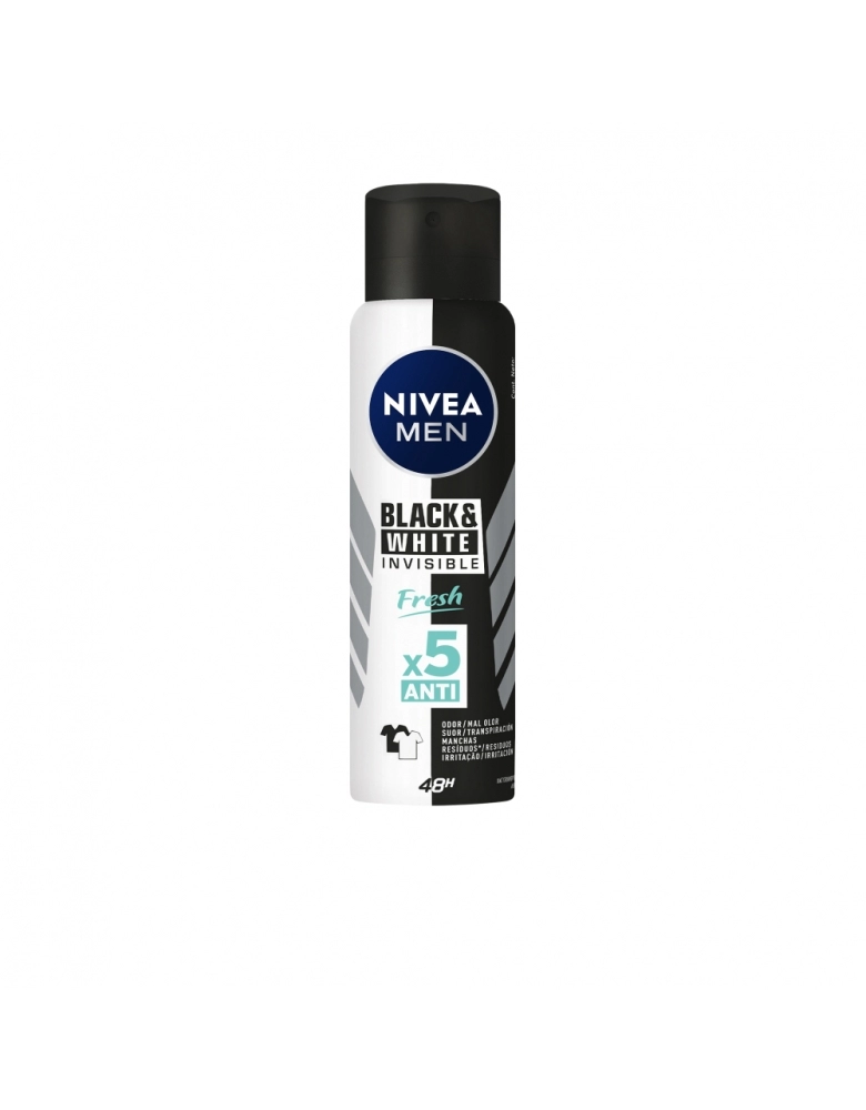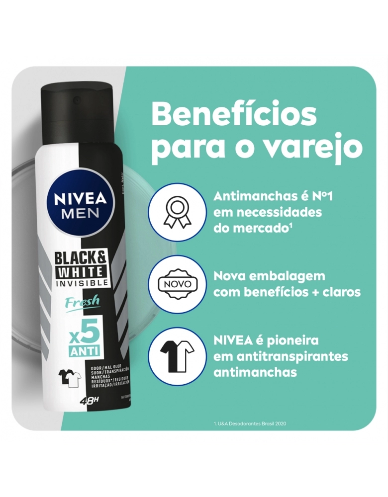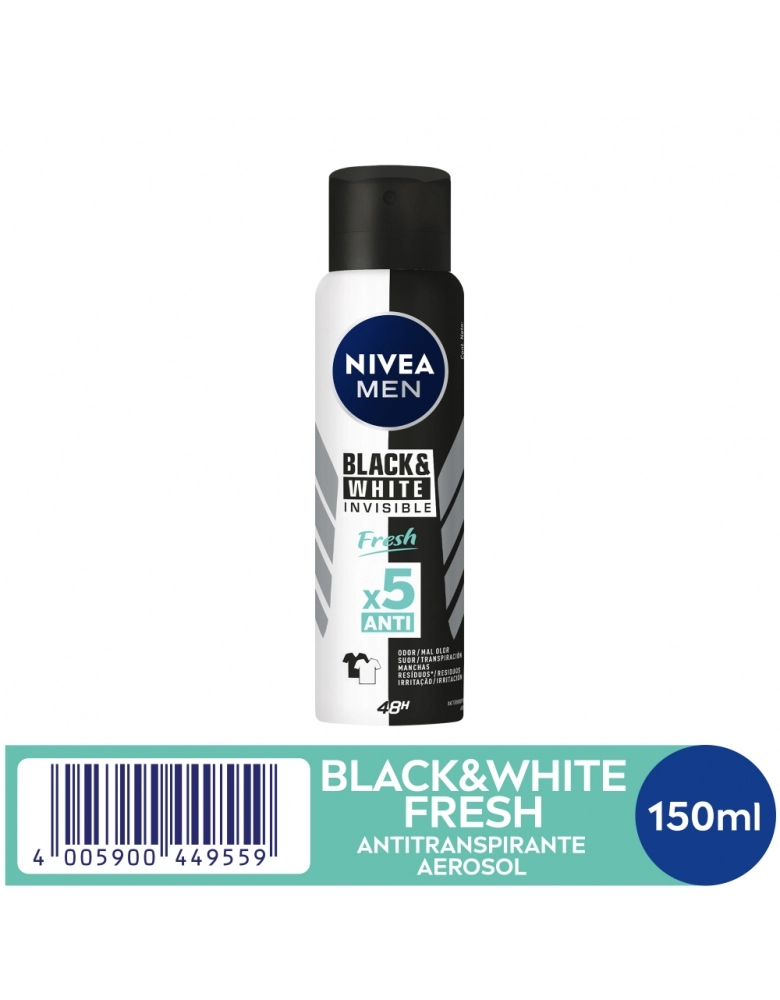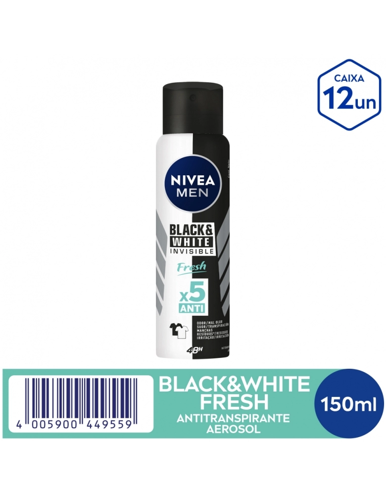 O que é? Desodorante masculino antitranspirante que refresca, protege por 48h e evita manchas nas roupas. Você livre de manchas, suor e mau odor. Confira! Para que serve o Desodorante Aerosol Nivea Men Invisible Black & White Fresh? Poderosa fórmula elimina 99,9% das bactérias e evita manchas brancas em roupas pretas e manchas amarelas em roupas brancas. Benefícios e diferenciais - A melhor proteção contra manchas e suor - 2x mais agentes antitranspirantes e minerais - Sem álcool etílico e corantes Como usar o Desodorante Aerosol Nivea Men Invisible Black & White Fresh? Agite bem antes de usar. Ao aplicar o produto, mantenha o frasco a aprox. 15 cm da axila. Espere secar antes de se vestir. Uma unidade de embalagem contém 150ml