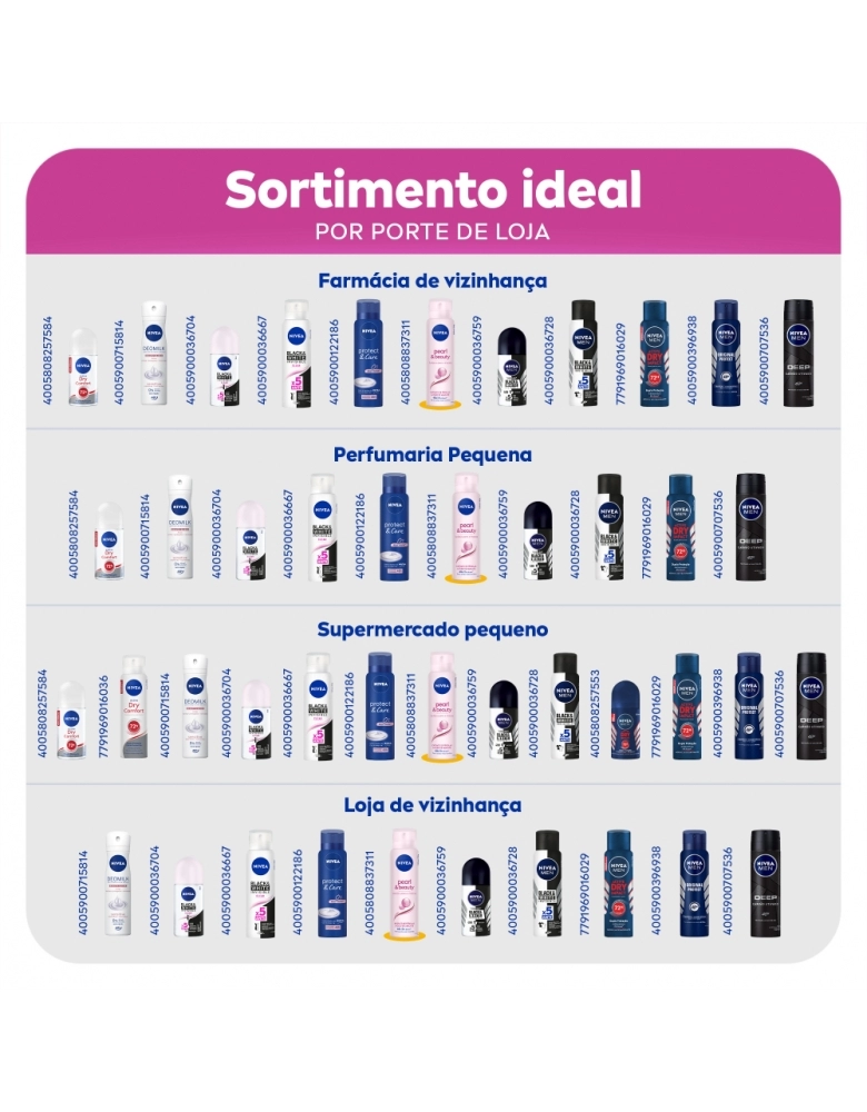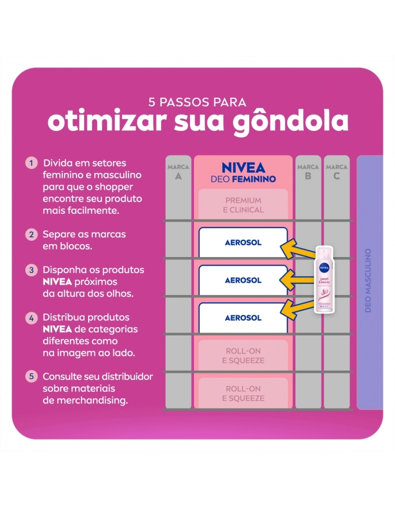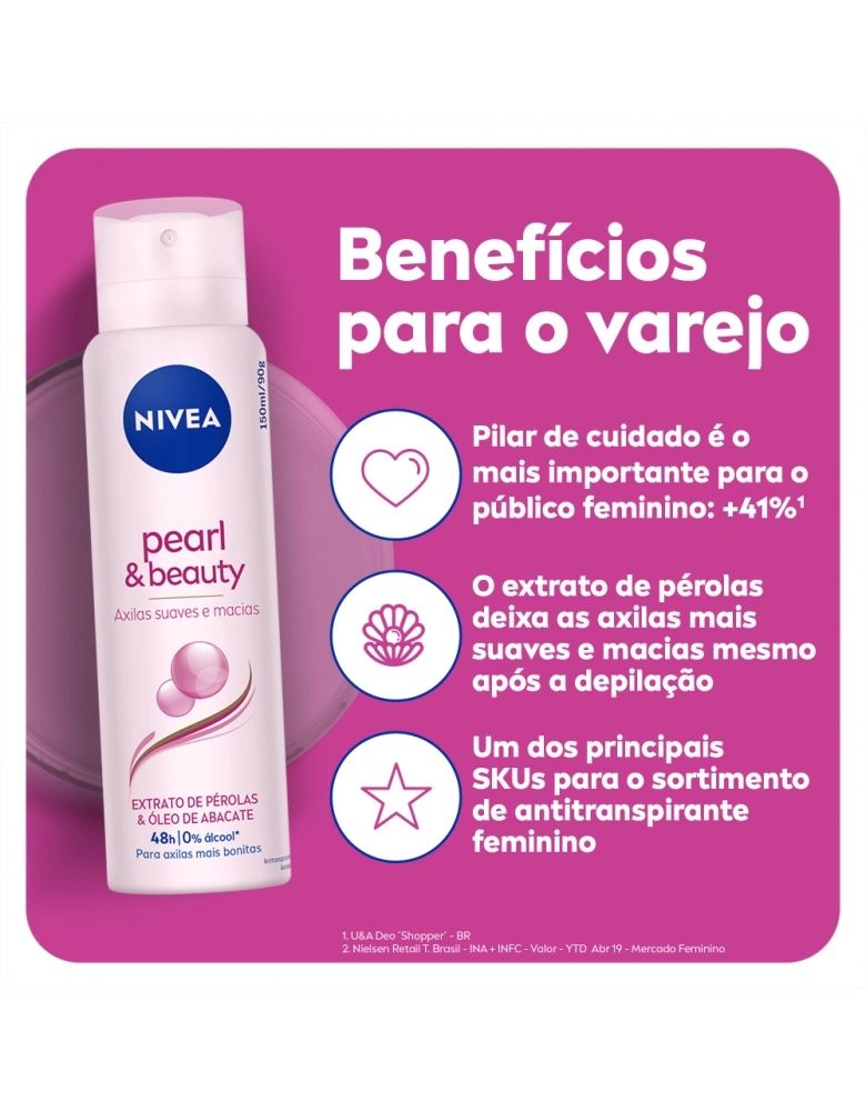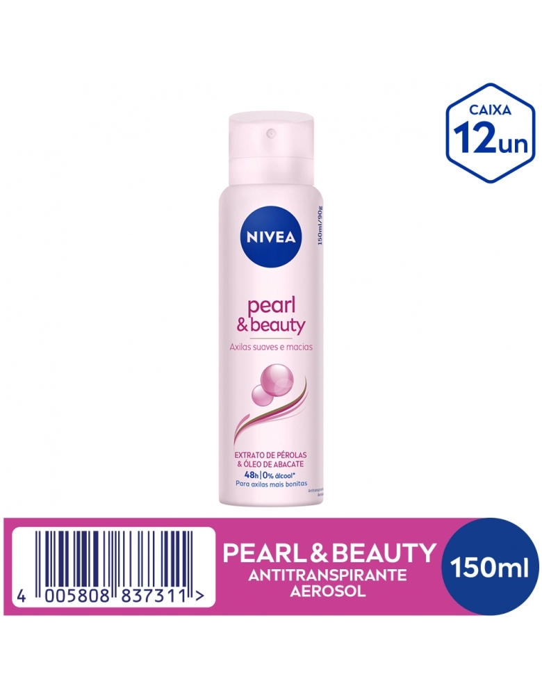 O que é? Desodorante antitranspirante que cuida das suas axilas contra suor e mau odor. Você com axilas bem cuidadas sempre. Aproveite! Para que serve o Desodorante Aerosol Nivea Pearl & Beauty? Enriquecido com precioso extrato de pérolas e óleo de abacate, este desodorante atua para dar maciez e suavidade à pele. Benefícios e diferenciais - 48h de proteção - Atua para dar maciez e suavidade à pele Como usar o Desodorante Aerosol Nivea Pearl & Beauty? Agite bem antes de usar. Ao aplicar o produto, mantenha o frasco a aprox. 15 cm da axila. Espere secar antes de se vestir. Uma unidade de embalagem contém 150ml