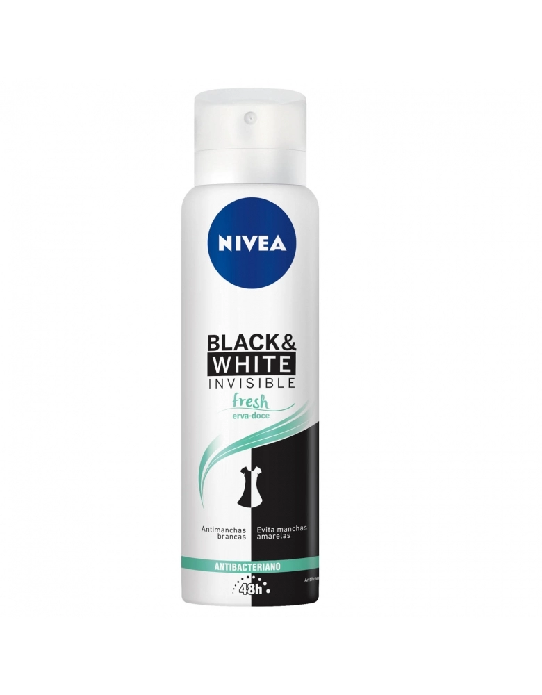 "NOVO NIVEA Desodorante Antitranspirante Aerosol 150ml Invisible for Black & White Fresh: Fórmula antibacteriana que elimina 99,99% das bactérias**. Protege suas roupas do preto ao branco. 48 horas de proteção e a refrescância da erva doce. Você livre de manchas***, suor e do mau odor. * *Elimina 99,99% das bactérias testadas: Corynebacterium xerosis e Staphylococcus epidermidis ***Evita as manchas"