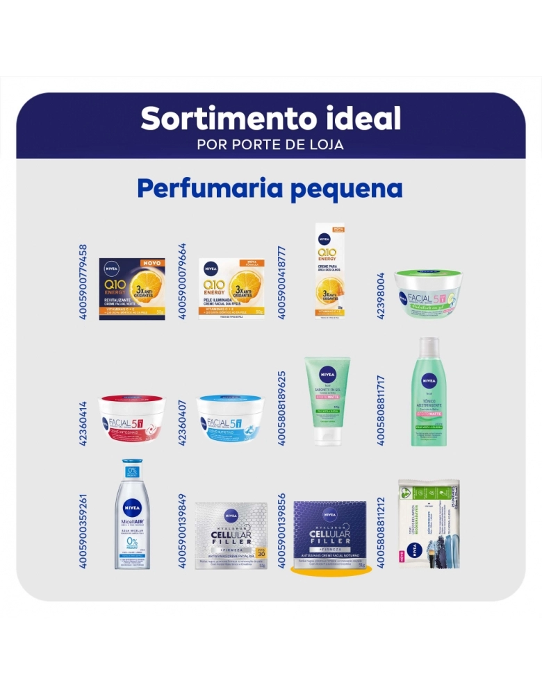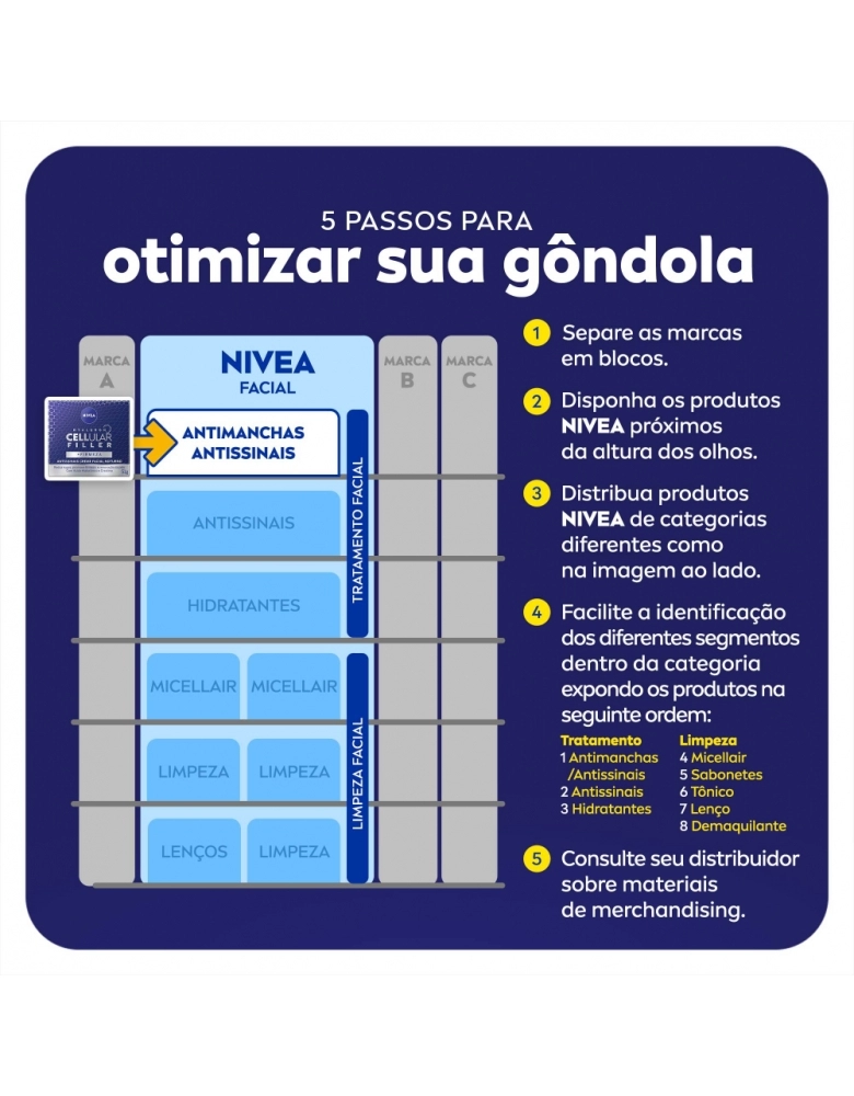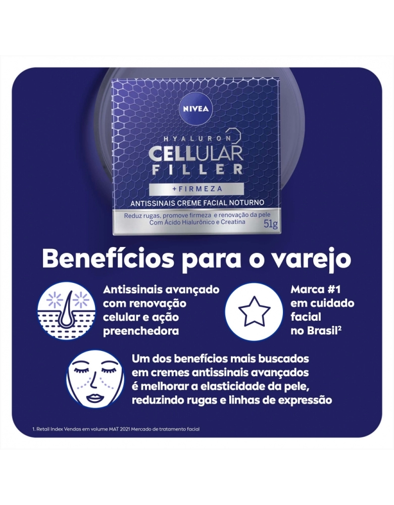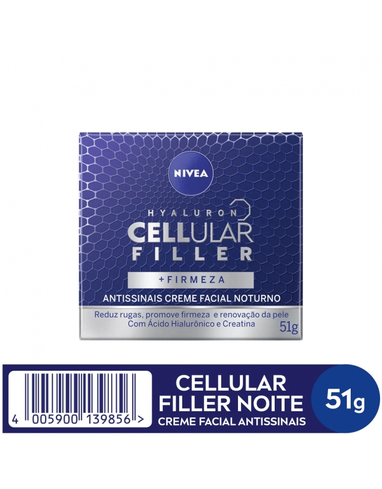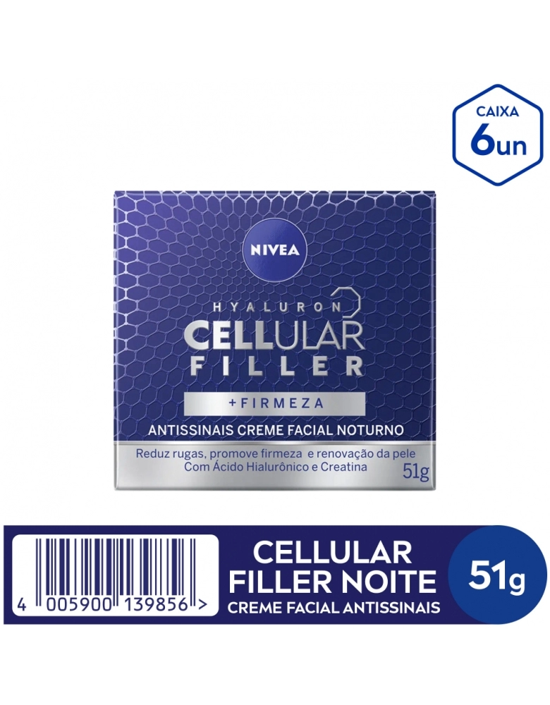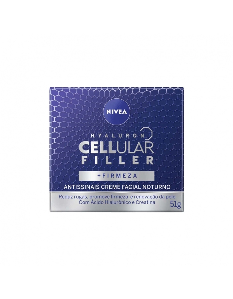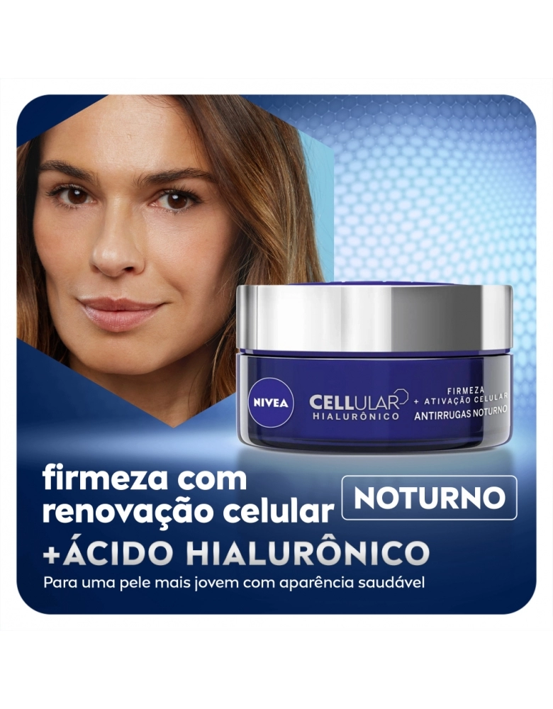 O que é? Creme facial noturno que reduz profundamente as rugas. Diminui linhas de expressão e deixa a pele com aparência mais jovem em apenas 4 semanas de uso. Garanta o seu! Para que serve o NIVEA Creme Antissinais Noite Cellular? Composto com ácido hialurônico, proporciona firmeza celular e renovação da pele. Reduz linhas de expressão em 2 semanas de uso. Benefícios e diferenciais - Resultados comprovados - Sensação de efeito lifting e pele firme - Ácido Hialurônico + Creatina + Extrato de Magnólia Como usar o NIVEA Creme Antissinais Noite Cellular? Com a pele limpa e seca, aplique no rosto e massageie suavemente até a absorção completa do produto. Use à noite. Uma unidade de embalagem contém 50ml