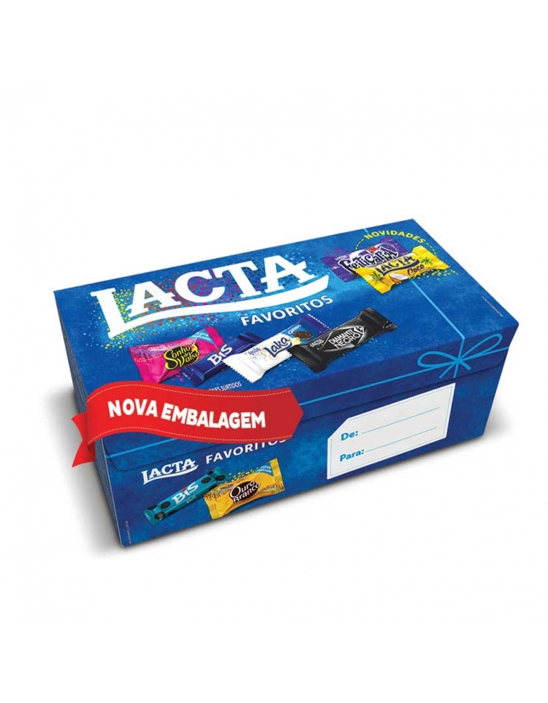 Caixa recheada com os favoritos da Lacta, tem para todo mundo e todos os gostos: Bis, Diamante Negro, Laka Oreo, Ouro branco, Sonho de valsa, etc...