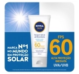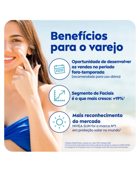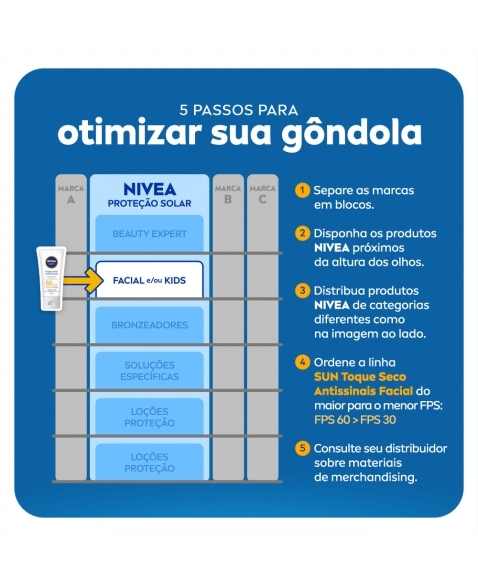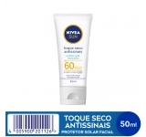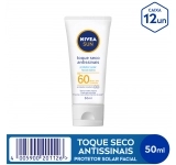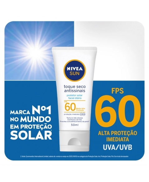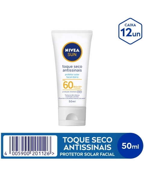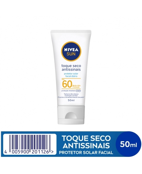 NIVEA Sun Facial Toque Seco Antissinais, é um protetor solar facial para uso diário. Com exclusiva fórmula de textura leve, rápida absorção e toque seco, controla o brilho e deixa sua pele macia e radiante. Além de oferecer muito alta proteção imediata UVA/UVB contra os efeitos do sol, previne o envelhecimento precoce da pele causado pela exposição solar/radiação. Perfeito para usar até mesmo antes da maquiagem.