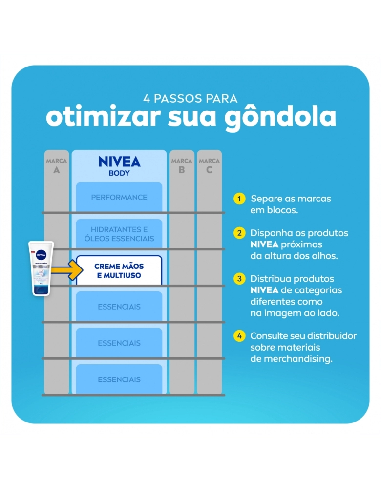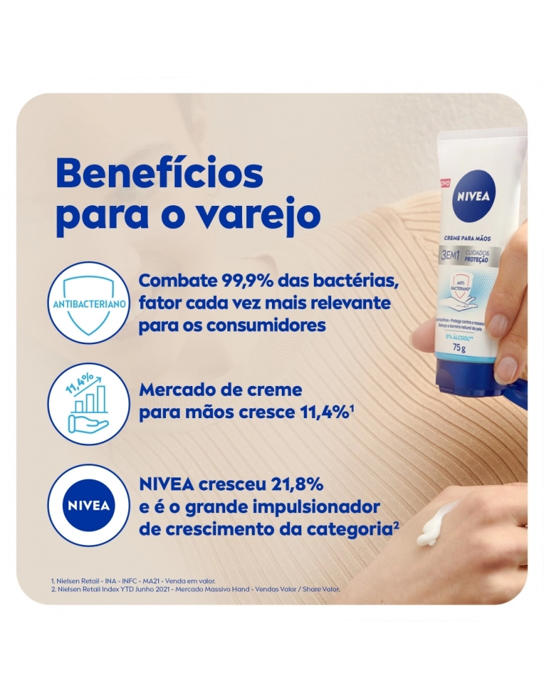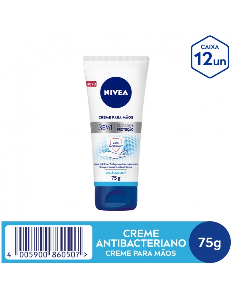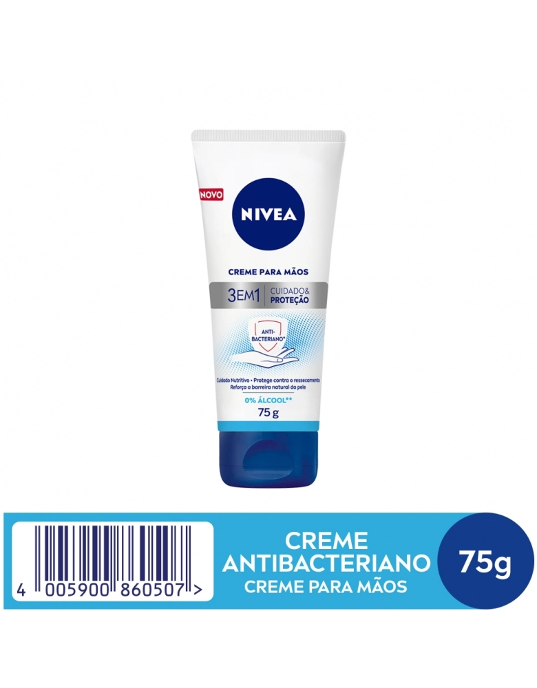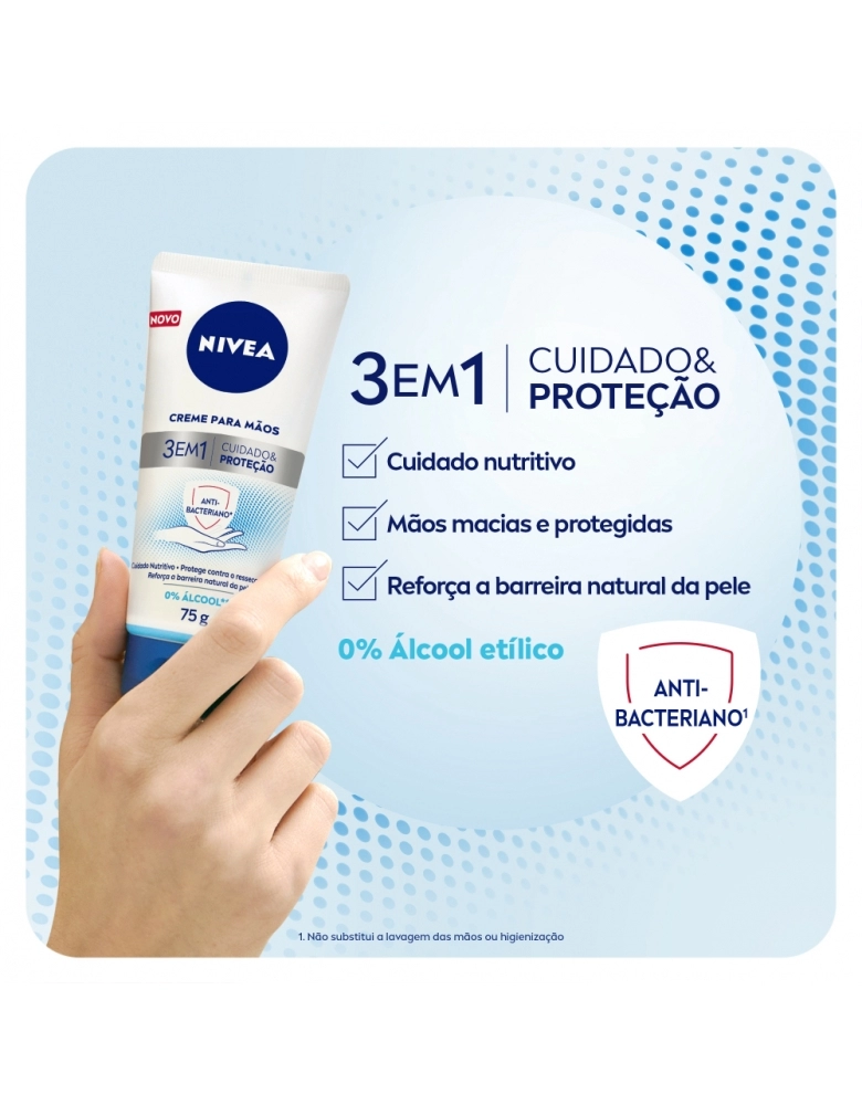 Mãos danificadas por conta da rotina de higiene? Conheça o novo NIVEA creme para as mãos 3 em 1, com ação antibacteriana* e sem álcool etílico. Sua fórmula enriquecida com óleo de jojoba hidrata profundamente as mãos, protege do ressecamento e fortalece a barreira natural da pele. *Não substitui a lavagem das mãos ou higienização.