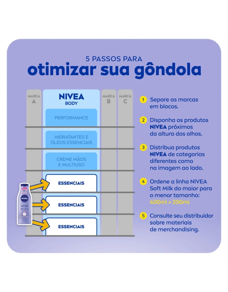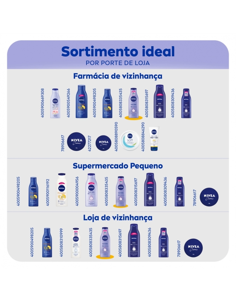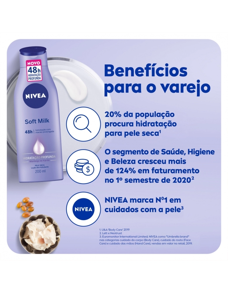 Enriquecido com Manteiga de Karité, NIVEA Soft Milk proporciona hidratação prolongada para a pele seca e desodoriza a pele.