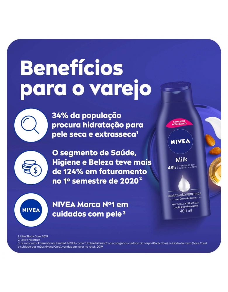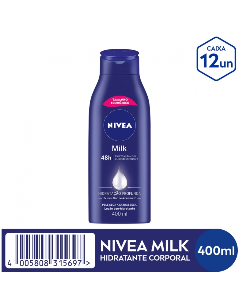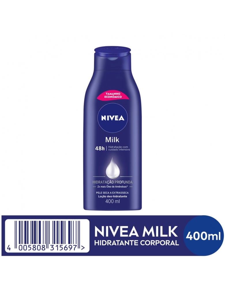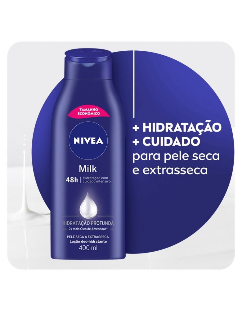 Loção Hidratante NIVEA Milk hidrata profundamente a pele e oferece um cuidado intensivo. Tem 2x mais óleo de amendoas, nutrindo intensamente por 48h. Garanta o seu!