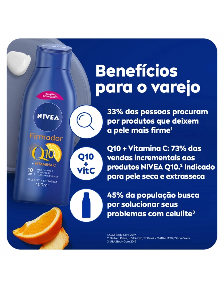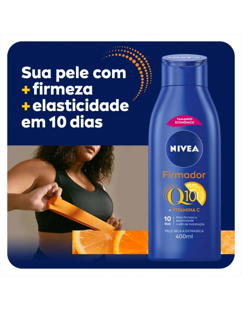 Fórmula enriquecida com dois poderosos antioxidantes, Q10 e Vitamina C, que combatem os radicais livres, melhora visivelmente a firmeza e a elasticidade da pele em apenas 10 dias. Além de prevenir a flacidez e hidratar a pele intensamente por 48 horas.