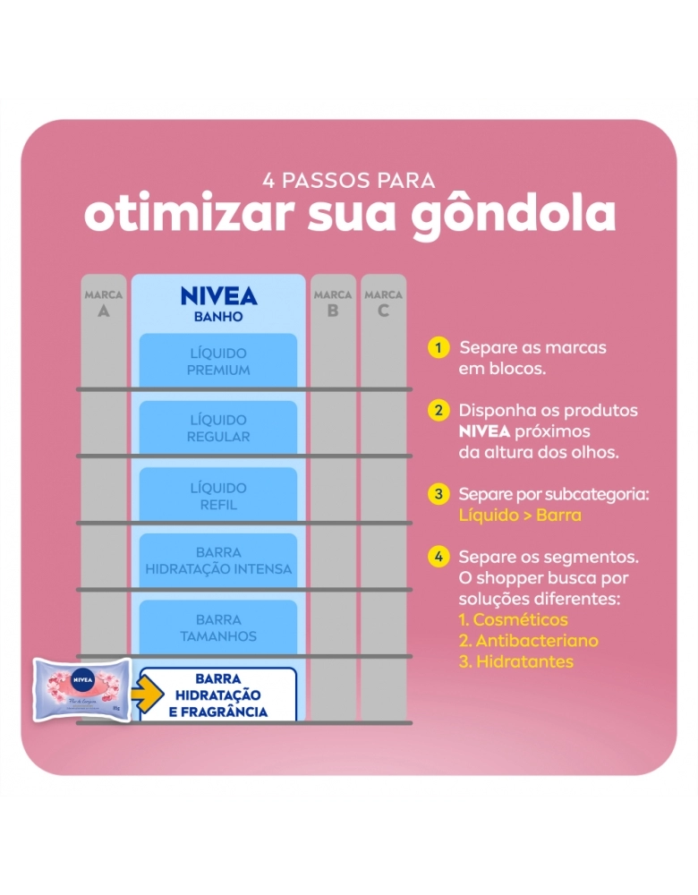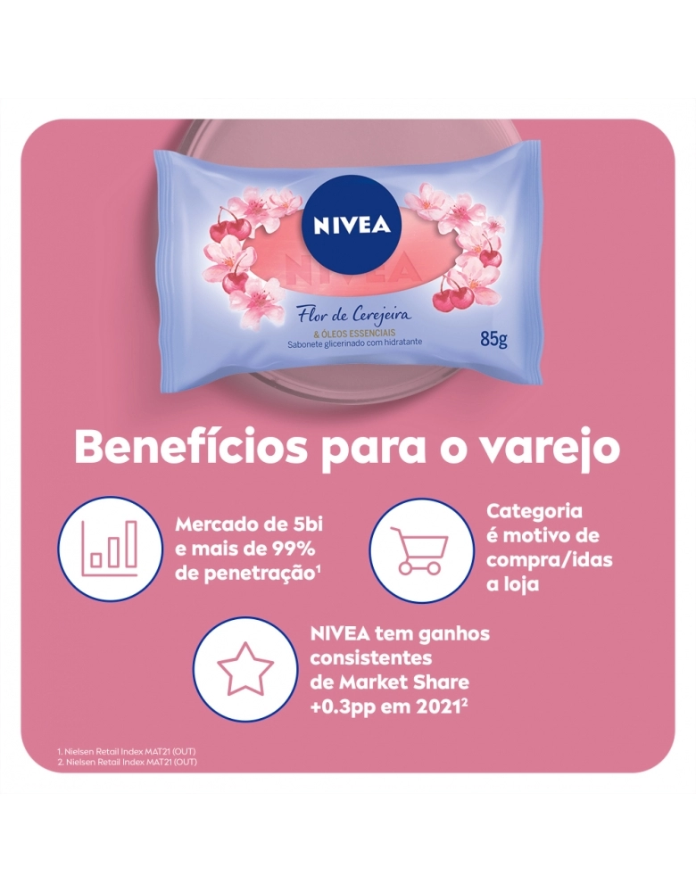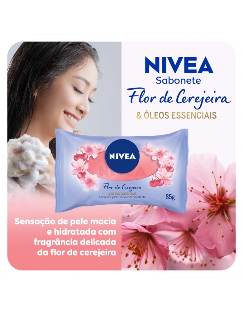 O cuidado com você começa no banho. O primeiro sabonete glicerinado com hidratante de NIVEA que limpa e cuida gentilmente da sua pele, para uma sensação de pele macia e hidratada mesmo após o banho. Com uma espuma cremosa e a deliciosa fragrância da Flor de Cerejeira & Óleos Essenciais estimula seus sentidos, deixando sua pele delicadamente perfumada por mais tempo após o banho. Dermatologicamente testado.