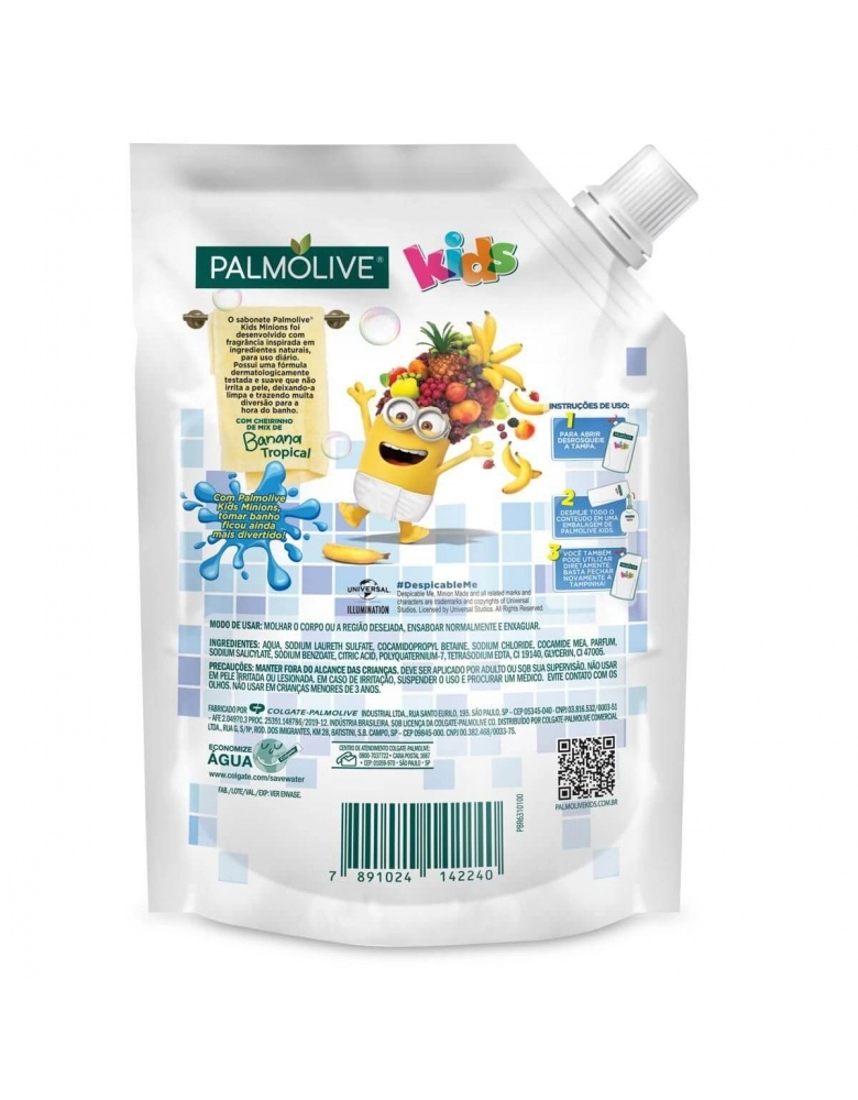 O sabonete líquido infantil Palmolive Kids Minions é um sabonete suave, dermatologicamente testado, indicado para crianças a partir dos 3 anos e desenvolvido com uma fragrância inspirada em ingredientes naturais. Com Palmolive Kids Minions, tomar banho ficou ainda mais divertido!