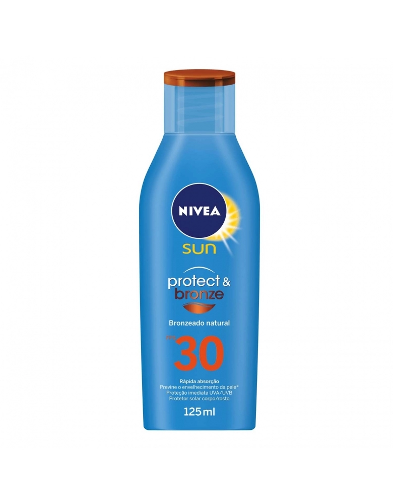 NIVEA SUN Protect&Bronze proporciona alta proteção imediata contra os raios UVA/UVB com textura leve, suave e de rápida absorção. Além de contar com uma combinação de Betacaroteno e Acido Glicirretínico em sua fórmula, que ativa a melanina e estimula o bronzeado natural da pele, ajudando a manter a cor bonita e uniforme por muito mais tempo.